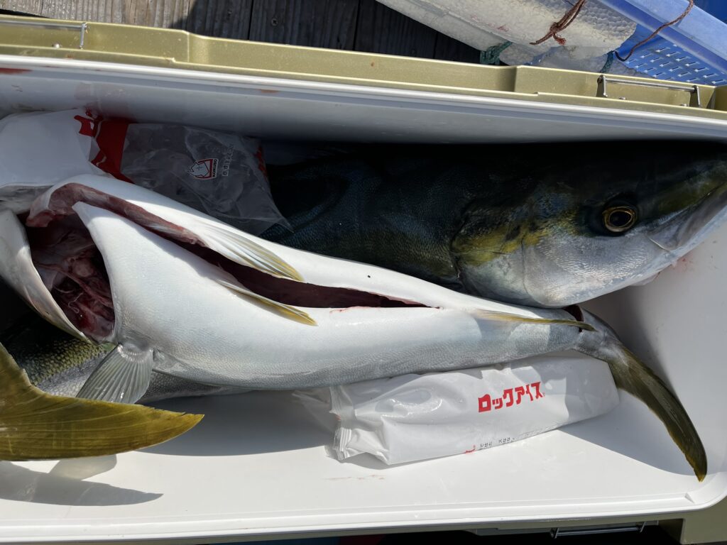 ベイトの中で、75.70.センチ肉厚ヒラメ。ブリ7匹10時迄に釣れました。